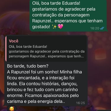 Veja o que nossos clientes dizem sobre a experiência com nossos personagens! Histórias reais de momentos inesquecíveis que encantaram crianças e adultos. Quer saber como é viver essa magia de perto? Confira os feedbacks e sinta a emoção de quem já viveu essa experiência!